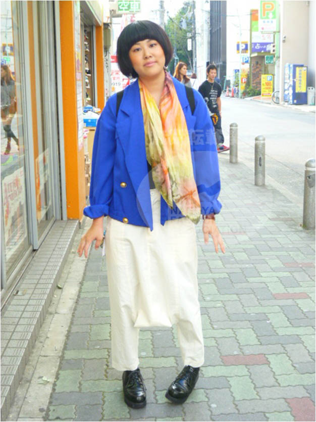 | コメント | 目の覚めるような鮮やかなブルーのジャケットに負けないくらい綺麗なスカーフをアクセントに☆チークの色みも服と合っていて、トータルコーディネートができているところが素敵!パンチのある色が名古屋らしい。パンツもオシャレ! |