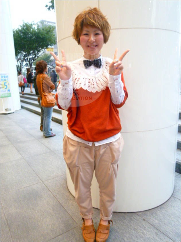 | コメント | 秋らしいオレンジのトップスに大きな襟。大胆にもそこにチェックの蝶ネクタイ! |