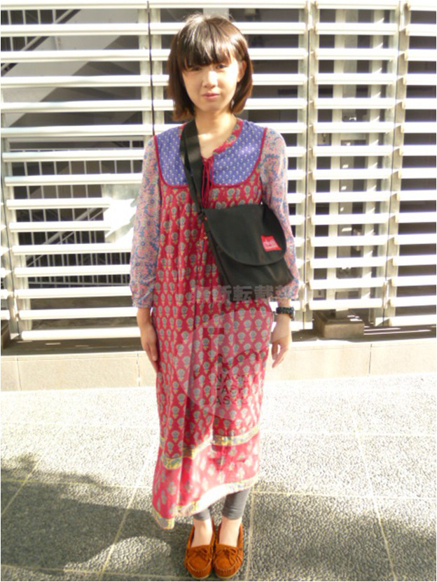 | コメント | 古着風の柄の長袖ワンピースにレギンス、メッセンジャーバックを合わせて独特な個性! |