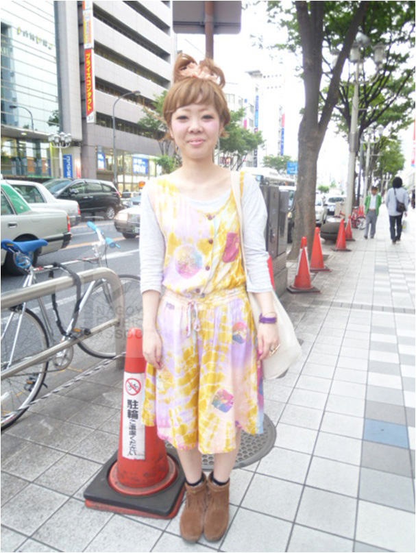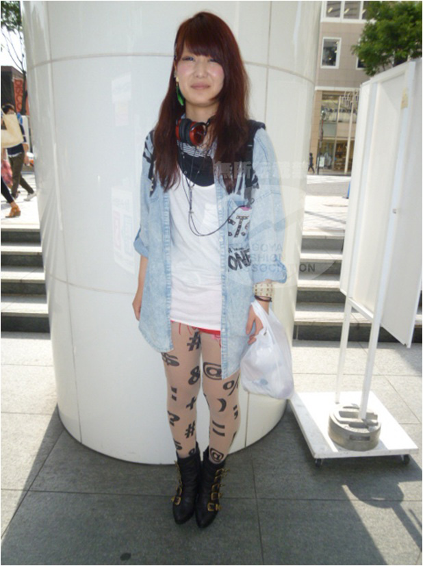 | コメント | ハイブリーチシャツをモードに着こなしたお姉さん。差し色にダメージショートパンツとヘッドフォンの赤が効いてる(^O^)/お洒落なタイツを履きこなしちゃう所が名古屋らしい! |