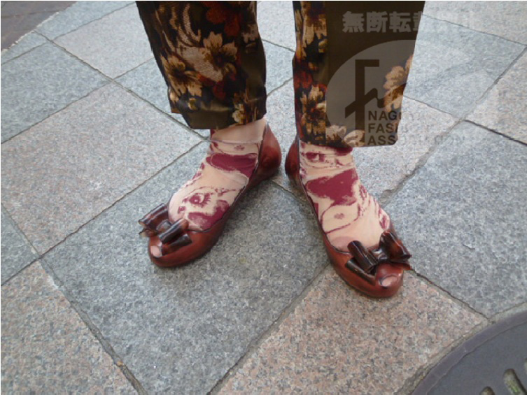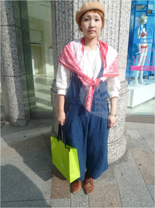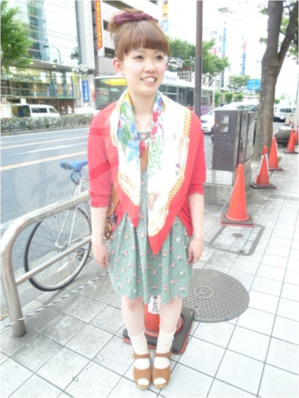 | コメント | 赤が効いた組み合わせ。スカーフ、流行りのショートソックスにサンダルでまとめている所が名古屋らしい。 |