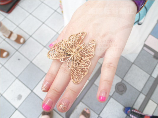 | コメント | 綺麗な色合いのワンピースをさらっと一枚で着こなし、大きくてインパクト大な蝶リング!ネイルも5本とも変えているところが名古屋らしい! |