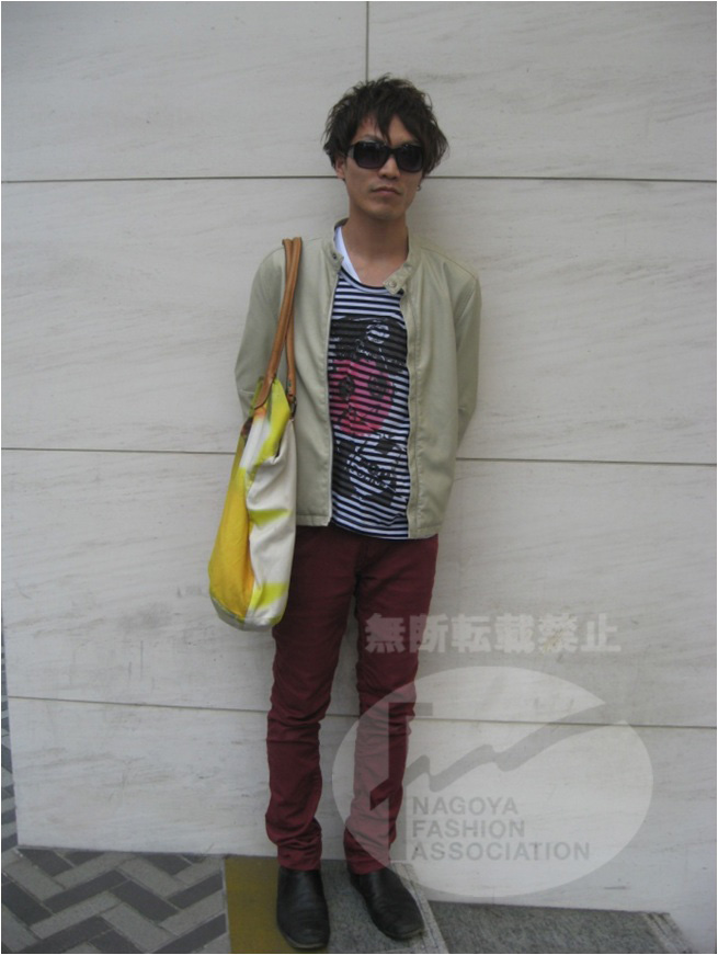 | コメント | 赤のスキニーにクリーム色のライダース。サングラスとゴアブーツが引き締めている☆Tシャツの赤&パンツのワイン&バッグのイエローというカラー使いがどこか名古屋らしさを感じる! |