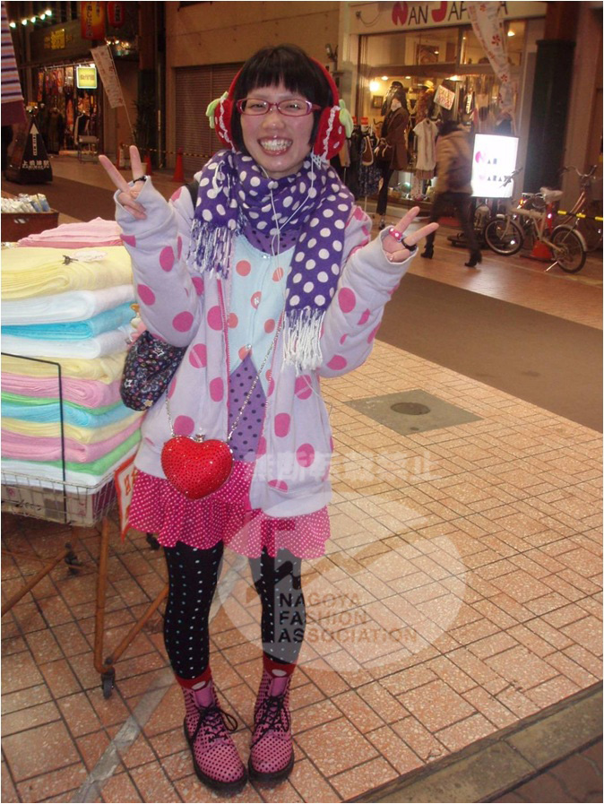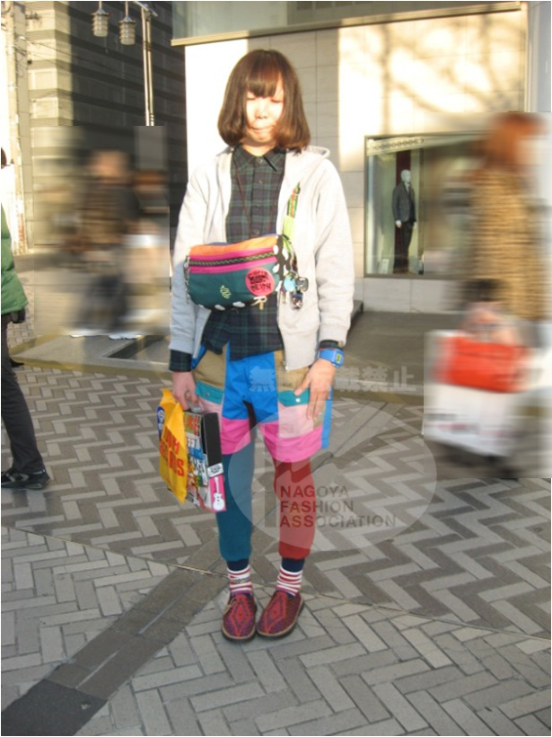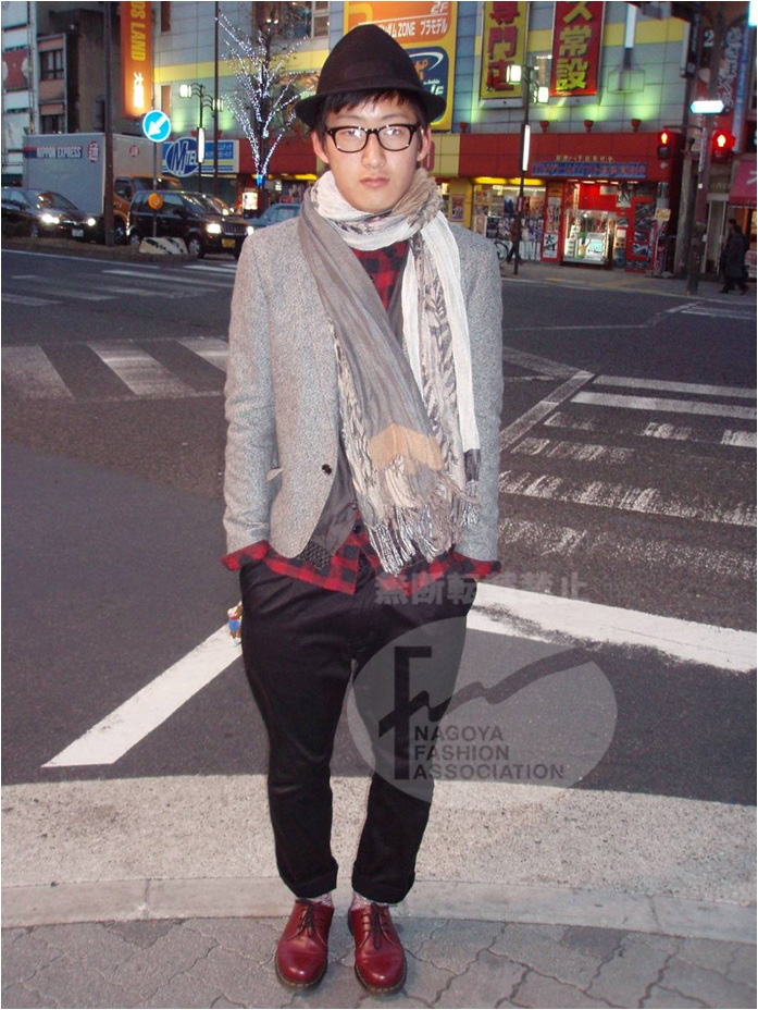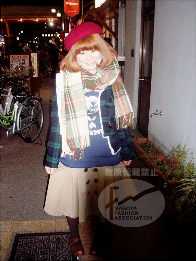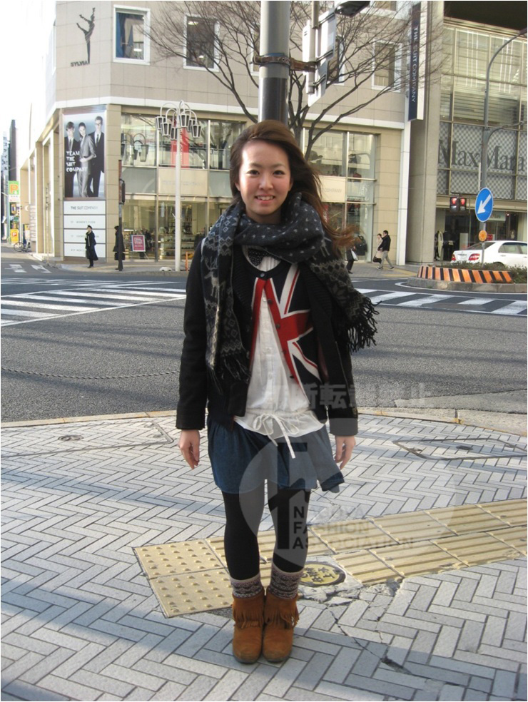 | コメント | 流行のノルディック柄を、ストールと靴下に取り入れ、大胆なユニオンジャックのジャケットで自分の個性をアピールしている所が名古屋らしい。 |