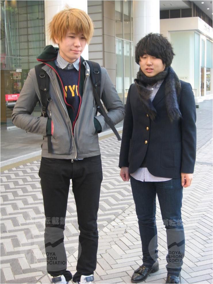| コメント | 写真右側のポイントは、インナーとして着ているパーカーのパイピングが赤いところ!!差し色に明るい色を持ってきて髪の毛の色との統一感を出している所が気を配っていて名古屋らしい!!写真左側は、60年代に流行ったアイビールックを彷彿させるコーディネート。古き良きものを現代のファッションに取り入れおしゃれを楽しんでいる所が名古屋らしい。 |