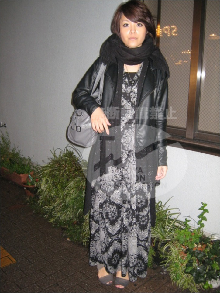 | コメント | 流行のフルレングスとレザーJKのソフトハードな異素材コーディネート★首元にボリュームをもたせてアクセント!!!!!靴やバッグなどの小物をグレーにして変化をつけるところが名古屋らしい★★★ |