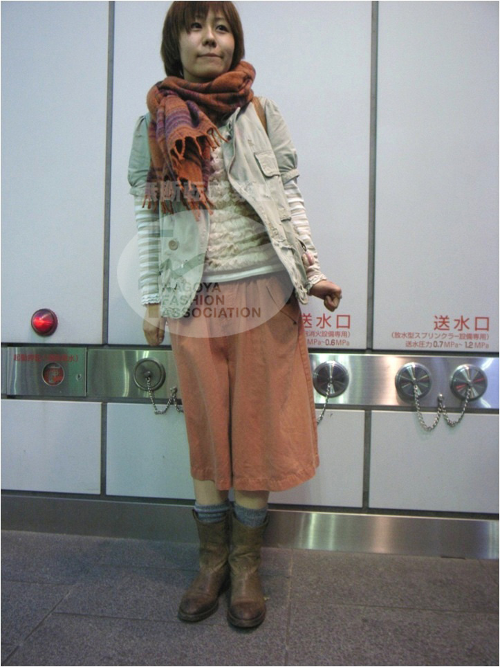 | コメント | 同じトーンの色使いで、全体をまとめているコーディネート。ボリュームのあるストールと丈の長いキュロットスカート、さらにブーツからのぞく靴下とのバランスが素敵★トップスと袖口のフリルなど細かい所にも気を使い、名古屋らしい。 |