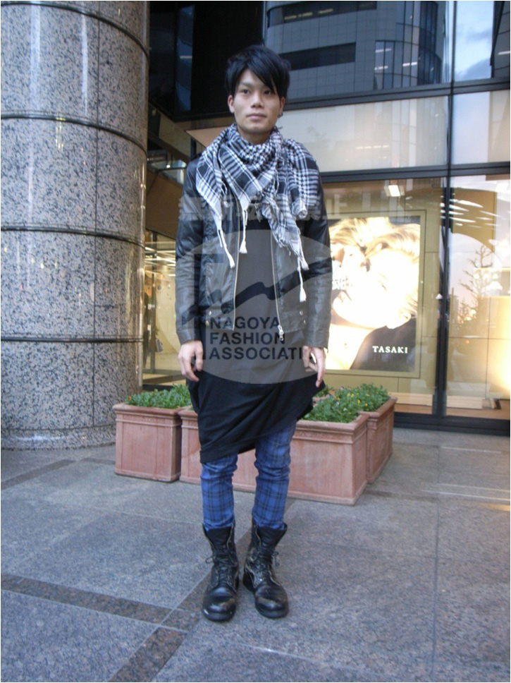 | コメント | ストールとパンツをチェックで揃えているのがポイント☆膝まであるインナーがユニセックスな雰囲気にしているロックスタイルは名古屋らしくて個性的。 |
