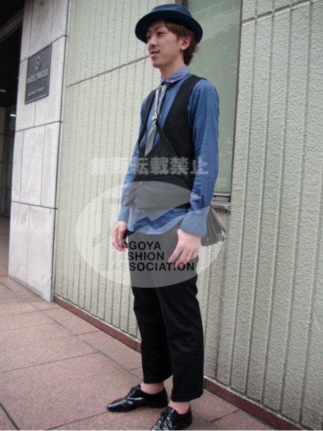 | コメント | 黒と青でまとめシックだけれど、カラーの違う衿や斜め掛けのポシェットタイプのバッグでかわいらしさと個性を出した名古屋らしいシックなスタイル。 |