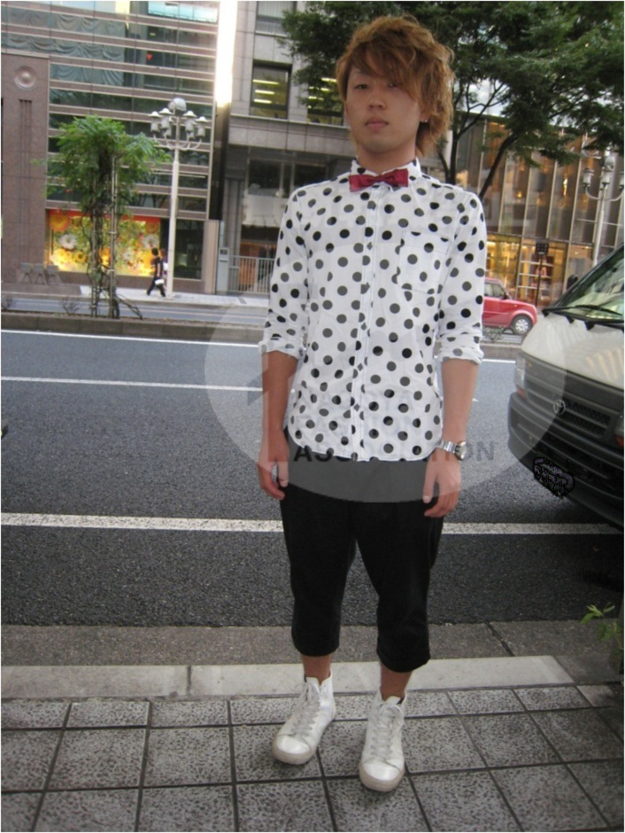 | コメント | 蝶ネクタイが大流行?!柄シャツ×蝶ネクタイでカジュアルダウンしたコーディネートが名古屋らしい。 |