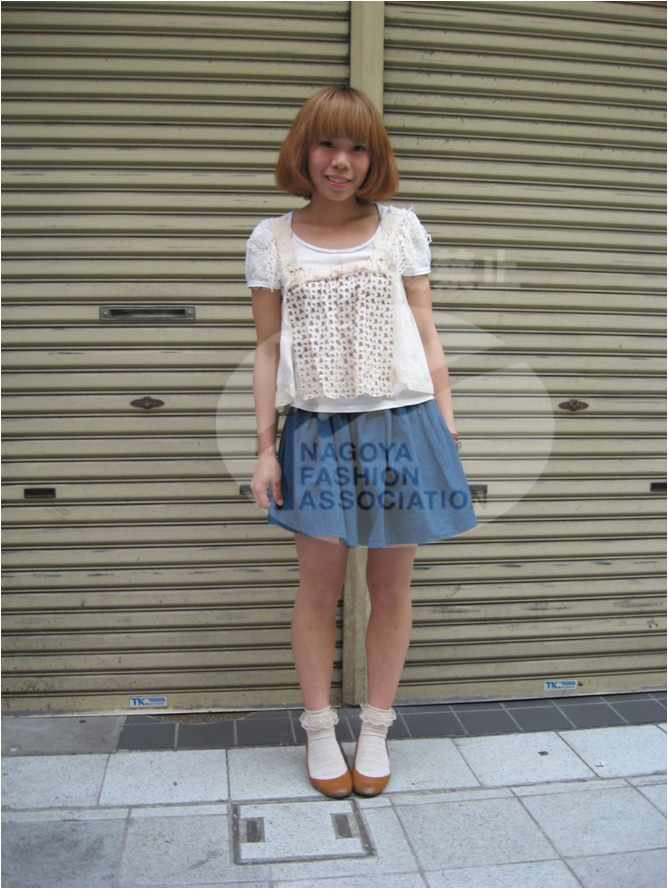 ベーシックな白のTシャツに少し丈の短い、今年流行のクロッシェレース付きキャミソールの重ね着☆足元には、短いフリル付きソックスに茶色のパンプスを合わせてレトロな雰囲気を感じさせる(*^。^*)シンプルで甘さを主張しすぎないガーリーコーディネートが新鮮で名古屋らしい☆ |