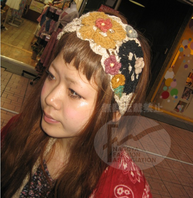 <hair特集>女の子☆全体的にフンワリしたイメージにぴったりあったかぎ針編みヘアバンド☆カラフルな色使いが名古屋らしくて、コーディネートのポイントになっている(^^♪ |