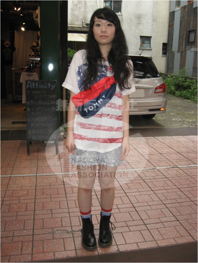 国旗が派手なカジュアル名古屋girl♥Tシャツ、カバン、靴下の色が国旗カラーで統一されていて、まとまりのあるコーディネートに♪ |