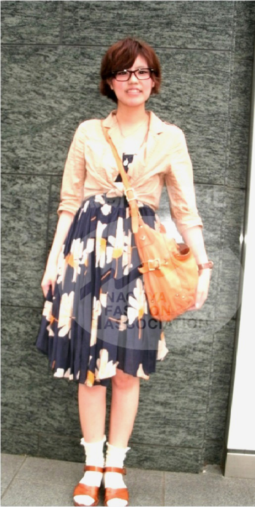 アパレルで仕事をしている先輩をGET!!レトロなワンピースが目をひく女らしいコーディネート。大きな柄が名古屋っぽくて素敵!小物を茶系でまとめているのがポイント。 |