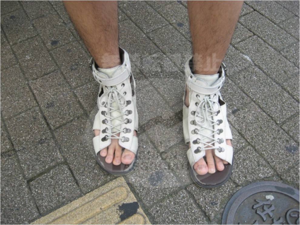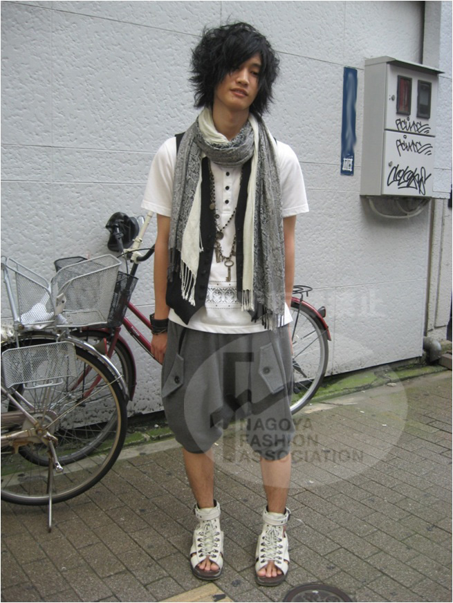 モノトーンでまとめたシンプルなコーディネートだけど、小物づかいがとてもおしゃれ☆☆シンプルな中で、ストールを何枚も重ねていて、派手さを出しているのが名古屋っぽい(^_^.)!!あと、男性で珍しい、編み上げのサンダル☆もう暑いので、これからの季節、大活躍しそう!!! |
